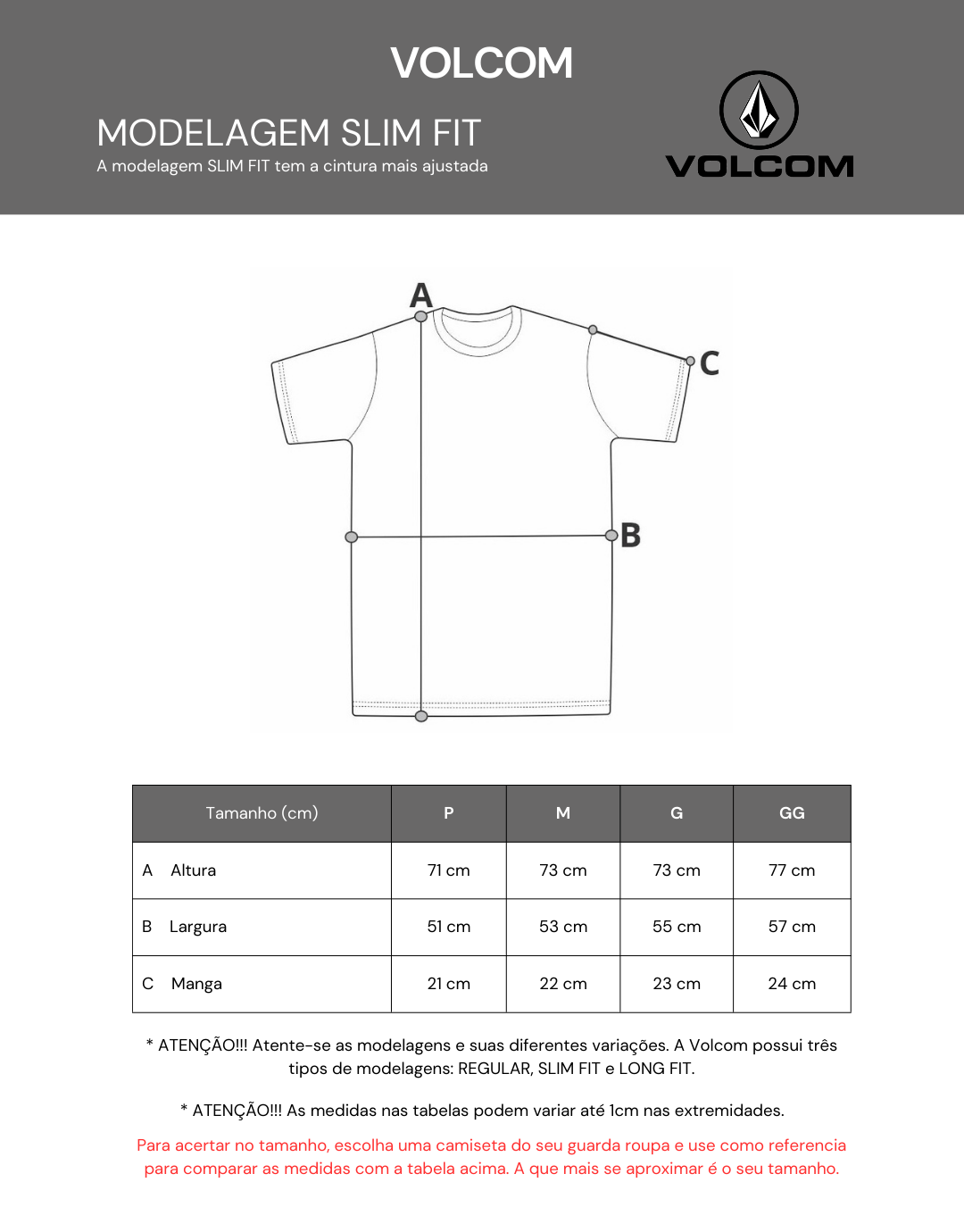 Para não ter erro na hora de escolher seu tamanho, confira as medidas da tabela com uma camiseta sua que você gosta, ai é só comparar os tamanhos e acertar na medida na hora de pedir.