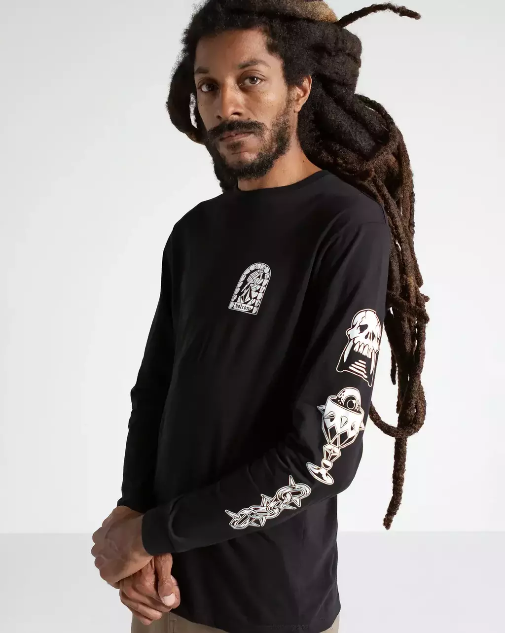 Camiseta Volcom Manga Longa Astrong Tower. Possui modelagem regular, estampa em silk frontal, nas mangas e nas costas e etiqueta interna.
