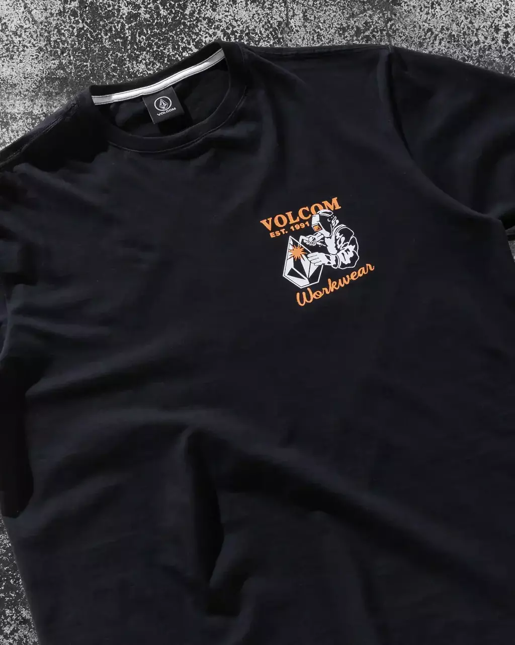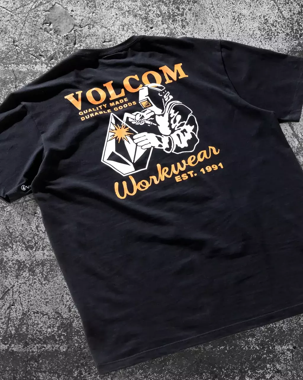 Volcom Workwear: quality made, durable goods. Camiseta Volcom Workwear Welder. Possui modelagem regular, estampa em silk frontal e nas costas, assinatura Volcom na manga, etiqueta interna e viés contrastante.